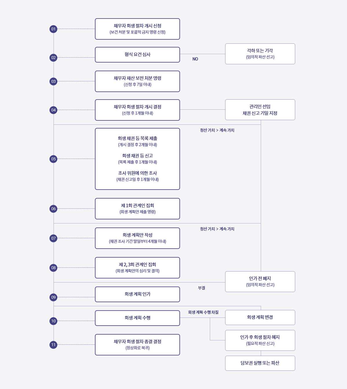 | 인가조건 | 회생계획안 가결조건(인가조건) - 회생담보권 의결권 총액의 3/4 이상 동의 필요 - 회생채권 의결권 총액의 2/3 이상 동의 또는 1/2 이상과 의결권자 과반수 이상 동의 필요 |