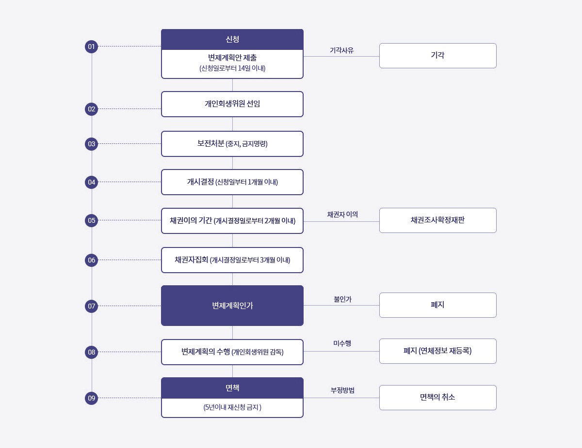 | 인가조건 | 변제계획안 가결조건(인가조건) - 채권자 동의 필요 없음 - 급여소득에서 부양가족의 최저생계비를 제외한 가용소득으로 변제 - 청산가치 보장 - 개시결정 이후 월 변제금의 납입 |